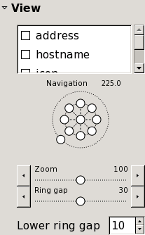 “Zoom” and “Ring gap” both control the overall size of the graph. “Zoom” changes the size of everything—hosts, labels, connecting lines. “Ring gap” just increases the spacing between the concentric rings, keeping everything else the same size. “Lower ring gap” gives a minimum spacing for the rings, useful mainly when fisheye is enabled.