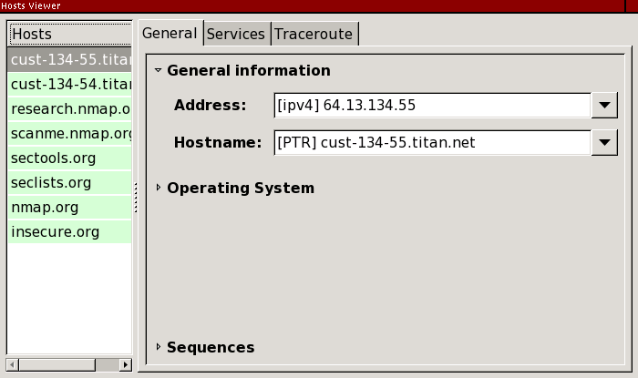 The host viewer is an alternative way to get details about hosts. Activate the viewer by clicking the “Hosts Viewer” button. All the hosts in the inventory are presented in a list. Select any host to get details about it.